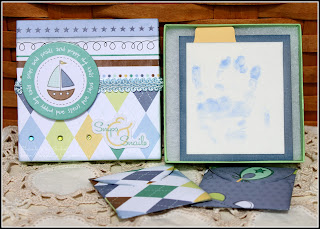 - Optional: Add a hand print of baby. Trim blue cardstock to 3" x 3". Trim hand print to 2.75" x 2.75" and mat. I included a tab punched from a Stampin Up Round Tab Punch.